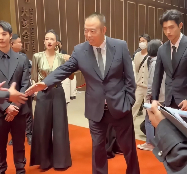 看到张颂文后,陈凯歌一手插兜一手伸出去握手,语气熟稔地说“诶,颂文,今天你整得真年轻”,搞得像两人很熟一样。