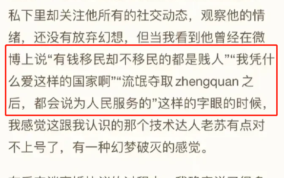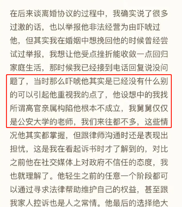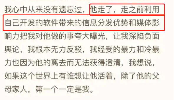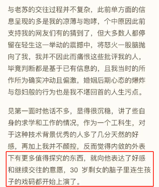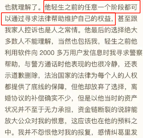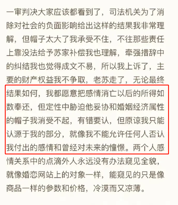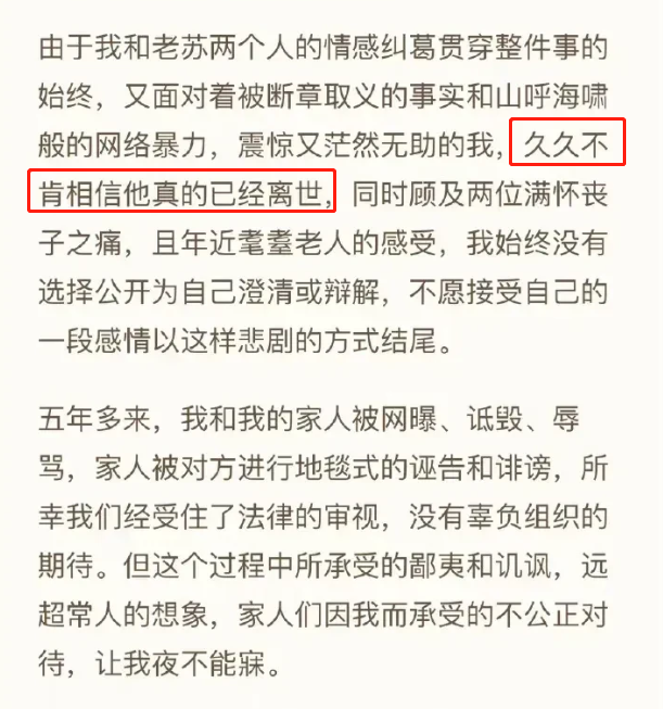 在这篇万字长文中,她将自己的过错摘得干干净净,把自己塑造成不知为何苏享茂会自杀的“小白花”,潜台词或许就是在责怪苏享茂的“脆弱”吧。