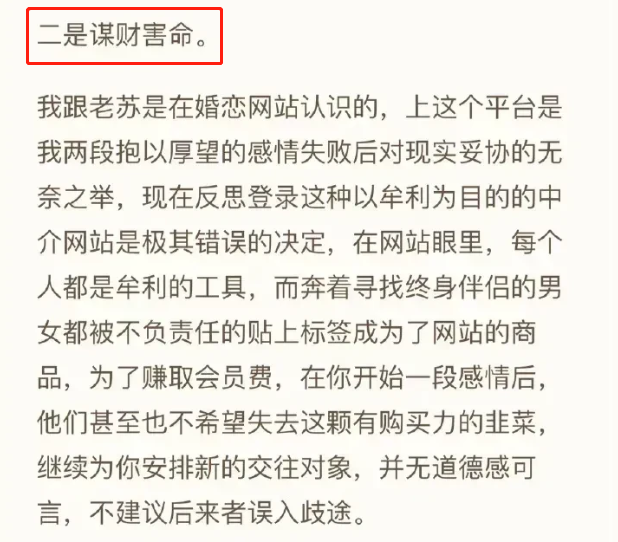 而自己也不是那种骗婚、谋财害命的人,自己理工科女生,收入高,家境好,不屑于干这样的事情。