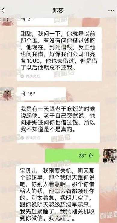 然后女明星邓莎和景甜的聊天记录被公开,邓莎问景甜她前任为什么一直问身边人借钱呢?还向田亮叶一茜借钱,还有于正,都是借钱不还。
