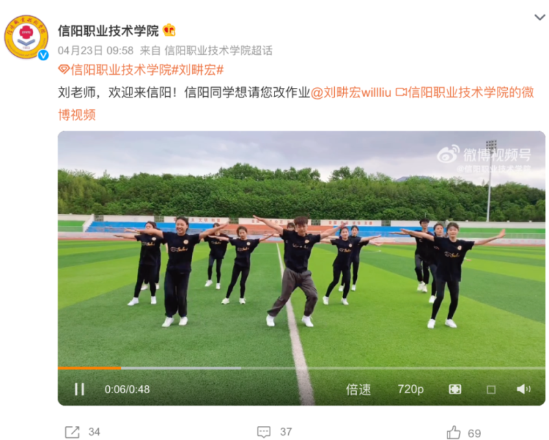 活动前一天,信阳学院还特意发了刘畊宏《本草纲目》的跳操视频,欢迎刘畊宏的到来。刘畊宏还在动态下方进行评论,因为学生们都相当期待。