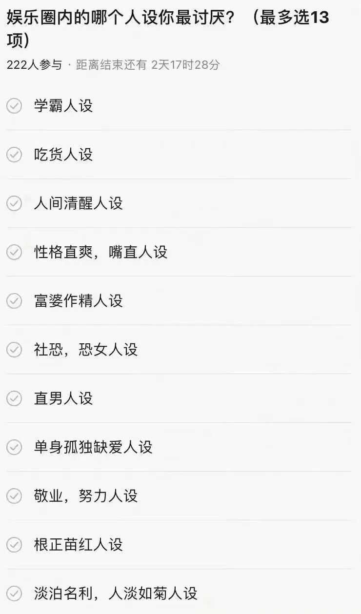 这也连带出“娱乐圈内的哪个人设你最讨厌?”话题引起热议,不少网友加入讨论,纷纷揭下明星们的面具。