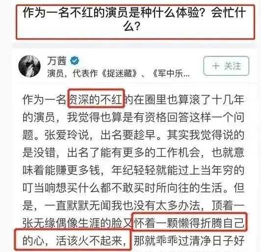 表面不慕名利,暗地里努力的还有万茜。2016年,万茜在某平台回答“作为一名不红的演员是种什么体验”时,自称“懒得折腾”。
