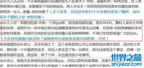 而且以前在关八中也有人爆料过某W姓男性是GAY,“关八”会长也肯定了W男星的确是gay。然而这位当红的W男星,网友们怀疑是正蹿红的王凯!那时候翻开王凯的微博关注,发现王凯与一个同志微博是相互关注的情况。有网友怀疑是王凯的高仿号,迅速点开果然是王凯本人。但如今王凯已经取关这个微博,同时这个微博也迅速销号。