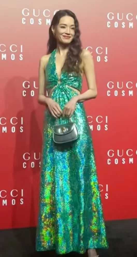 最后压轴的是舒淇,一出场就吸引了所有人的目光。她穿着深V口碑绿色长裙,搭配波浪卷的发型,让她看起来很有女人味,风情万种,妩媚动人。