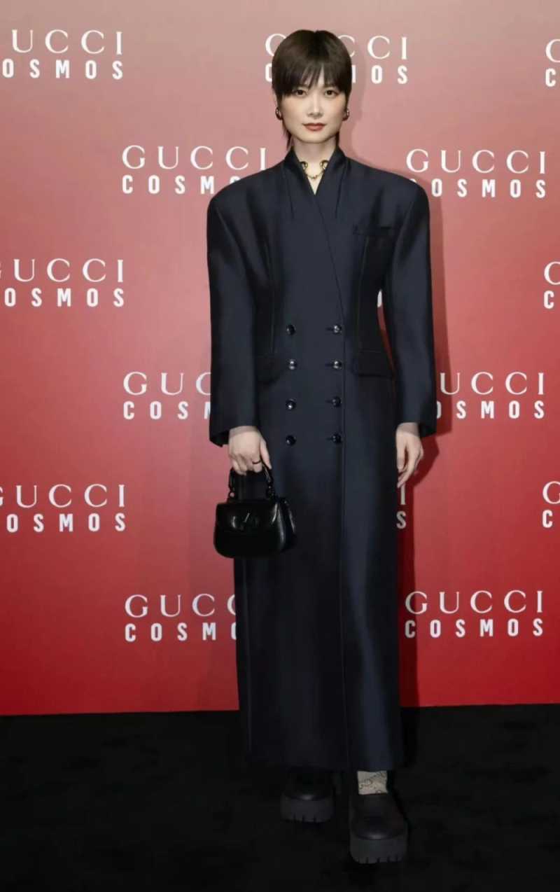 同样穿西装的,还有李宇春,黑色西装十分帅气。但是李宇春的这套衣服,肩膀部分太宽了,视觉上显得头部与肩膀比例失衡。