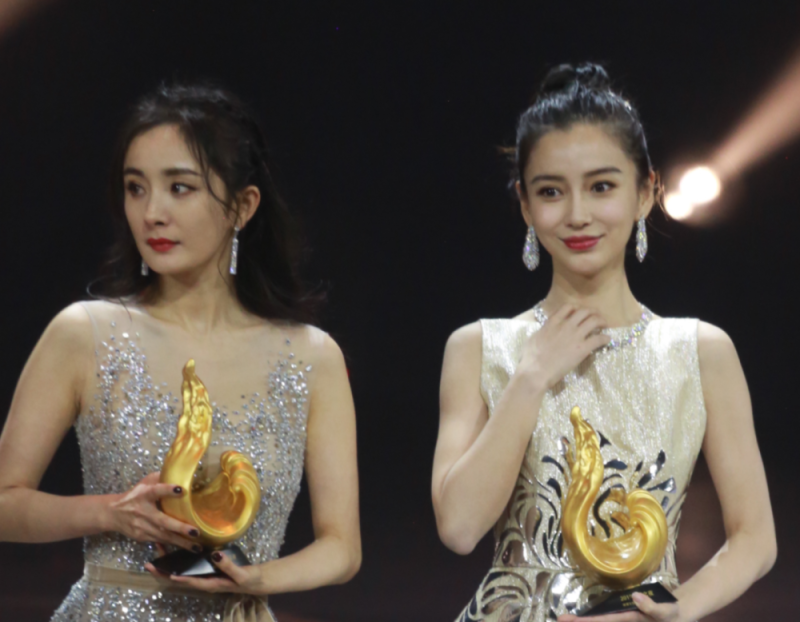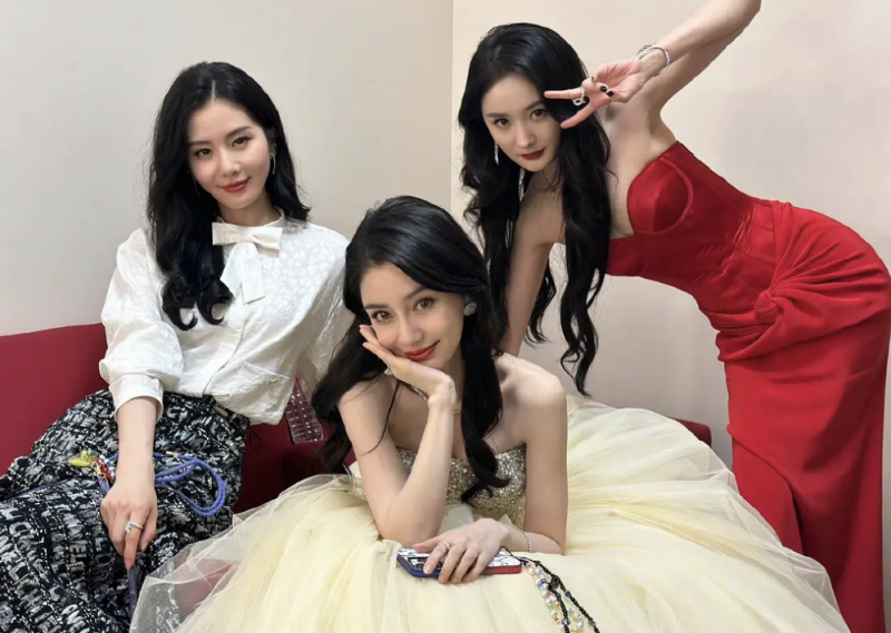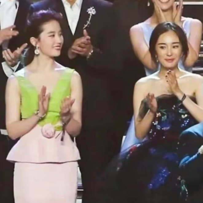比如这张合照里,此时的杨幂算是颜值巅峰期,妆造也不差,在一众女星中很抢眼,娇媚的眉眼是她的优势,但在刘亦菲的冷白皮和高挑的体态对比下,杨幂的光芒就明显被盖过了。