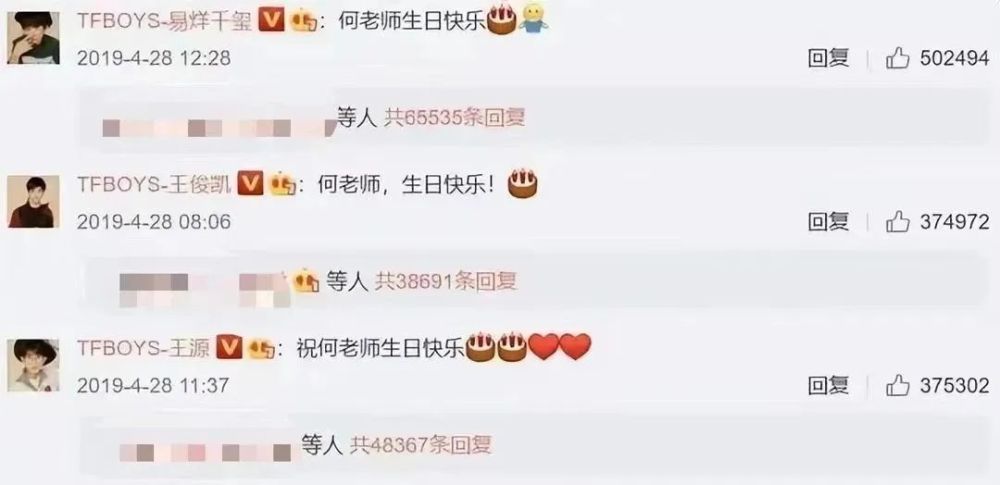 2019年,TFBOYS组合的易烊千玺、王俊凯和王源都为何炅送祝福,易烊千玺一条评论的点赞量更是达到50万。