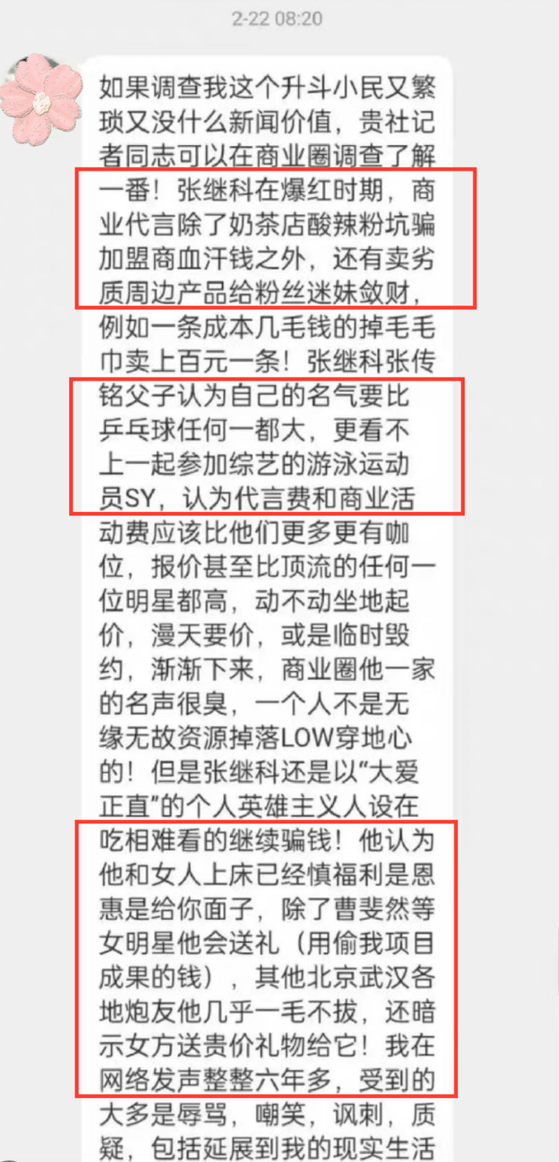 有一位知情人士于今年2月向某博主私信爆料,涉及张继科嫖娼、招妓、坑蒙拐骗、耍大牌等,信息量巨大。