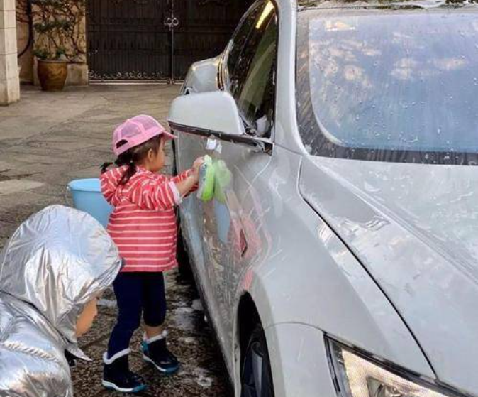 除了让儿子锻炼“吃苦”能力,郭晶晶也让女儿帮忙洗车。