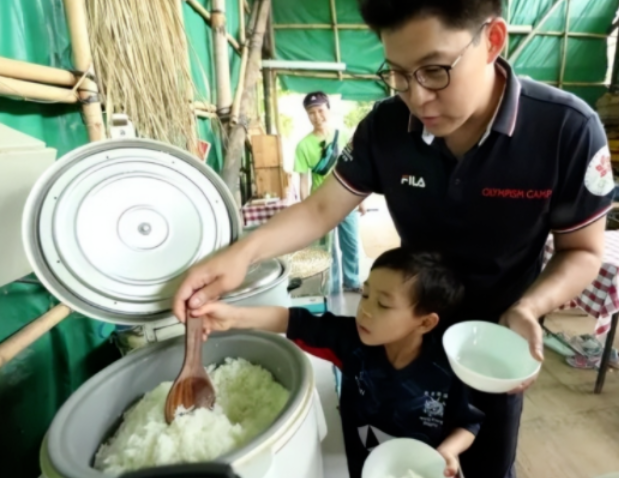 接着,他们还吃上了农家饭,霍启刚还教儿子自己盛米饭。