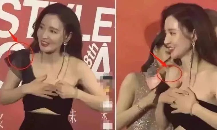 刘涛有一次也是在讲话时肩带滑落,由于身旁还有男士在,反应很快的刘涛赶紧把肩带挂了回去。