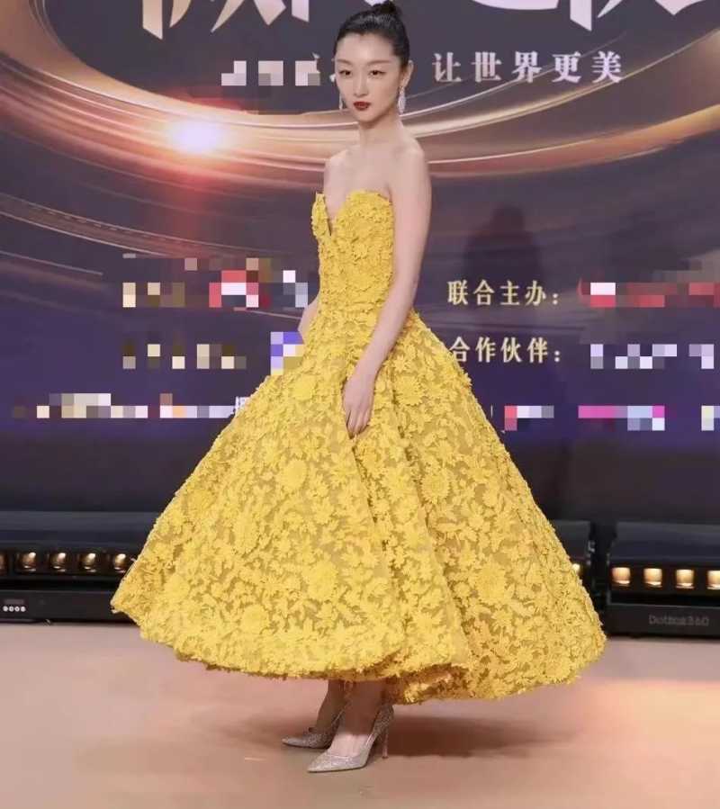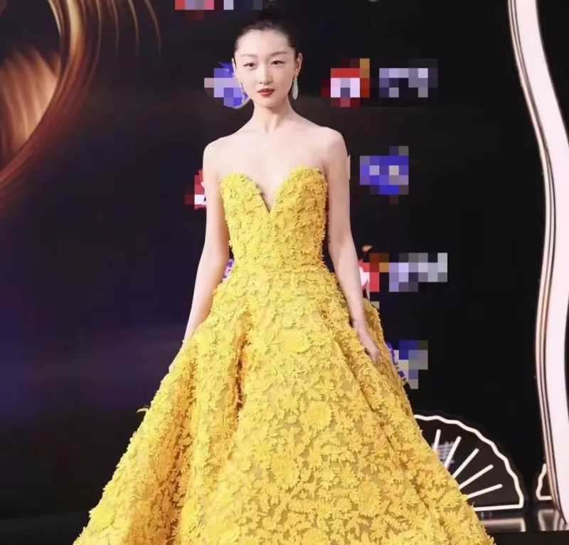 周冬雨的红毯造型有时也比较迷惑,比如她穿着黄色抹胸裙,因为突出的装饰很像炸鸡腿的外皮,网友们都戏称这是“炸鸡礼服”。