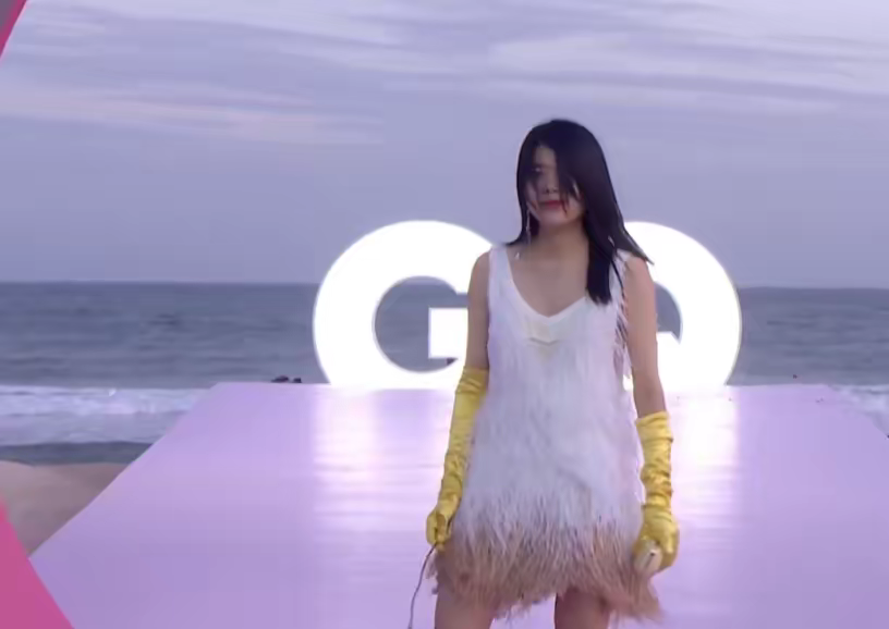 脱口秀演员杨笠流苏裙配上金色手套,时尚感满满,但头发把脸遮得都认不出这是谁了。