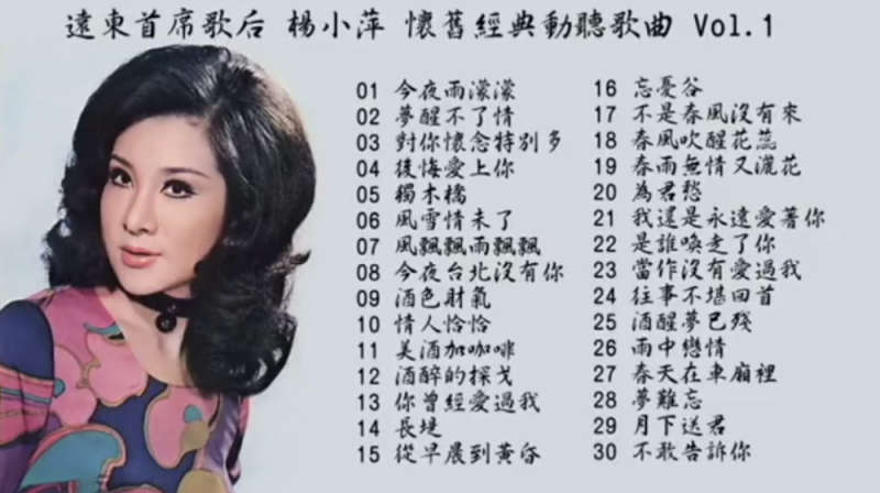 杨小萍的成名曲有很多,其中包括《酒醉的探戈》《梦醒不了情》《今夜雨濛濛》《月儿像柠檬》《关达拉美拉》等,在60年代她就已经火遍大江南北。