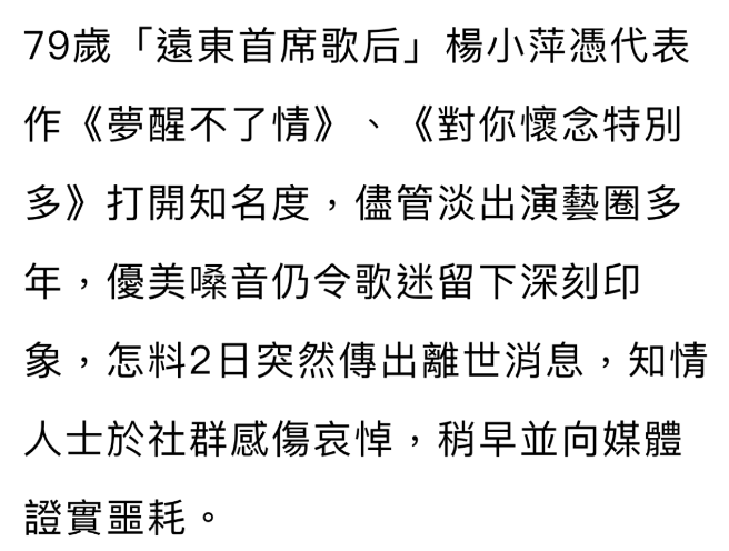 5月2日,娱乐圈突传噩耗,首席歌后杨小萍不幸去世,享年79岁,其业内亲友已证实她已去世。