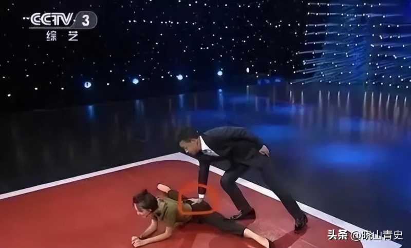 在一场节目的录制中,与朱军搭档的女主持为了节目效果正在做一个横叉的动作,本来这个片段也没有什么的。