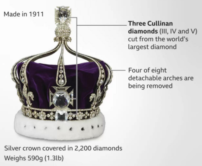 卡米拉将戴上玛丽王后王冠,该王冠由纯银打造,镶嵌2200颗钻石,还新加了3颗超大钻石。