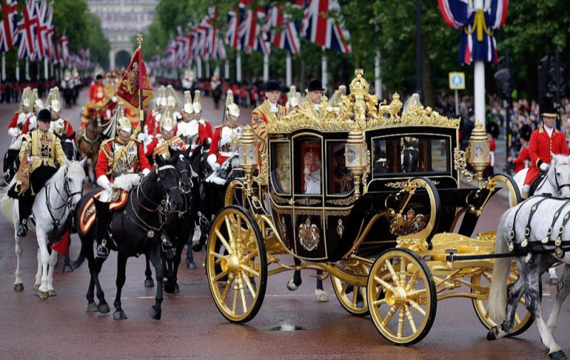 接着查尔斯三世率领王室成员登上奢华的皇家马车,被100名皇室骑兵护送,进行一大圈游行。