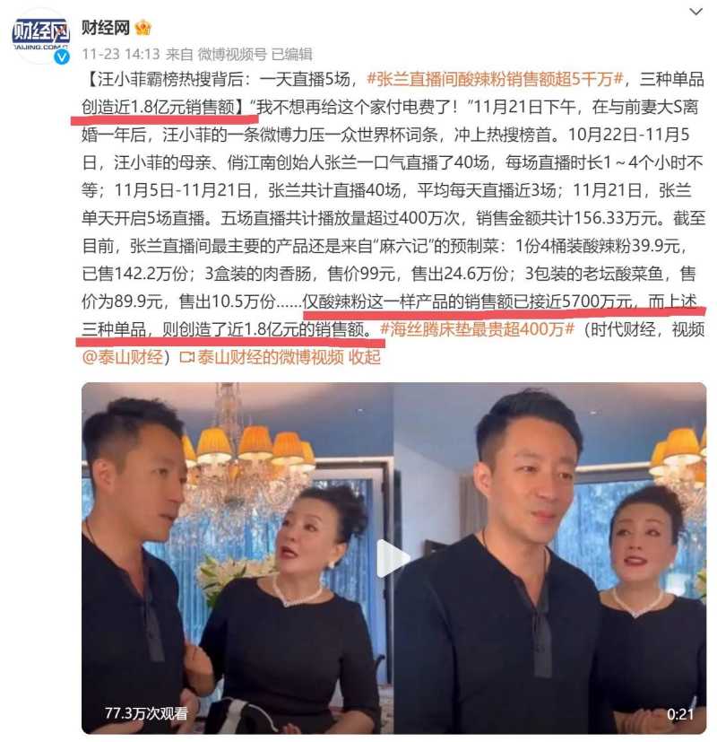 借助事件的热度,张兰在直播间里疯狂带货,仅仅一天就创造了1.8亿的销售额。