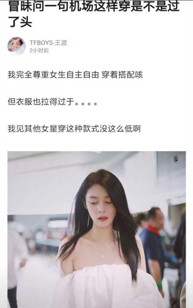 选秀爱豆出身的傅菁也同样因为机场照被讨论,她身穿白色泡泡袖一字领,被网友质疑虽然尊重女性的穿衣自由,但她一字领的领子也拉得太低了。