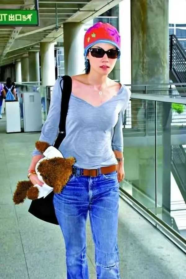 一字肩也是王菲的衣柜必备,无论是机场还是其他地方,都可以看见它的身影。头戴彩色方巾,一副炫酷墨镜,灰色一字肩随意洒脱。