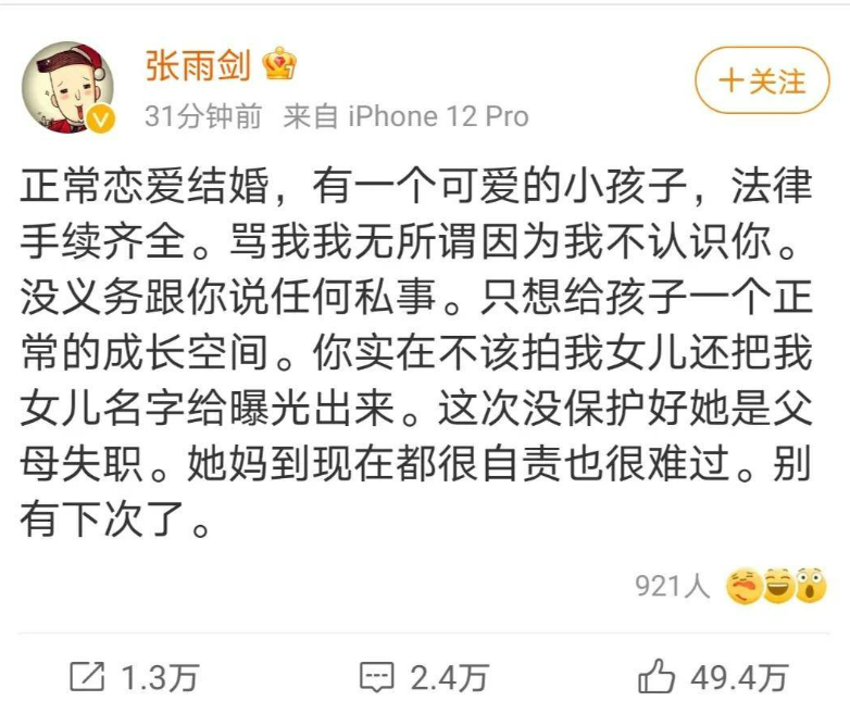 这回张雨剑终于出来回应了,但从头到尾都没有提到吴倩的名字,称她为“他妈”,并且字里行间都是把孩子被曝光的事情全怪在吴倩头上,