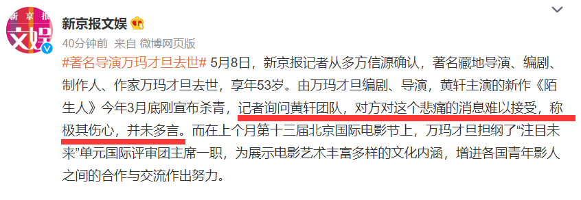 万玛才旦去世前拍摄完的最后一部电影是《陌生人》,是改编他自己所著的同名小说,由黄轩、旺卓措主演,该片在今年3月底才刚刚杀青,没想到仅仅过了一个多月,万玛才旦就去世了,记者询问黄轩团队,对这个悲痛消息难以接受,因太过伤心并未多言。