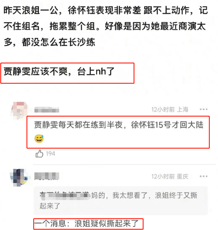 而且这才是初舞台呢,网上就已经流传起了“徐怀钰与贾静雯不睦”的消息,说徐怀钰不认真排练,让同组的贾静雯非常不爽,两人“撕”起来了!