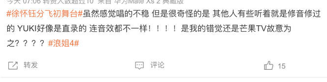 在贾静雯、吴倩、张嘉倪等姐姐唱歌时,后期都给修音了,而徐怀钰就是原声演唱,连音响效果都没有。