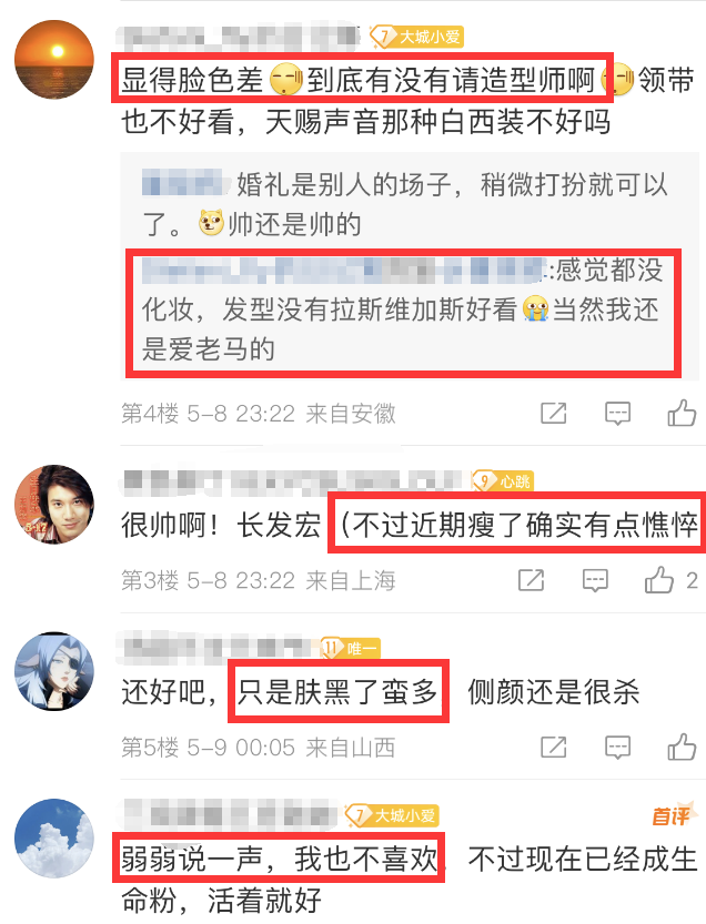 就连粉丝都难以接受王力宏现在的模样,质问有没有请造型师,还吐槽领带不好看,其实参加好友的婚礼低调一些是对的,毕竟婚礼是别人的主场,但他可以选择一些清爽的造型,看上去会更舒服一些。