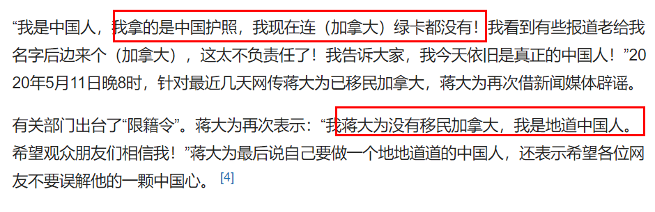 但其实蒋大为不止一次针对国籍的问题进行辟谣。2020年,蒋大为出来辟谣,自己是中国人,拿的是中国护照,他现在连加拿大的绿卡都没有,那些说他移民加拿大的报道是不负责任的。