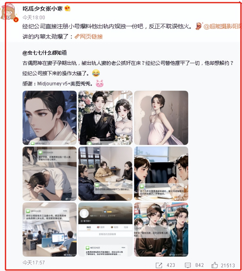 4月28日,吃瓜少女张小寒又爆出了一个圈内的大料:某古偶剧男神在妻子孕期内出轨,还被对方的老公捉奸在床!