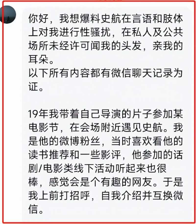 4月28日,一位女士公开爆料,声称自己多年前被史航性骚扰,她本人越想越憋屈,所以选择曝光,希望更多女孩能看清他的真面目。