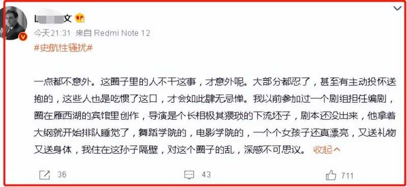 “史航性骚扰”的新闻曝光后,有业内人士表示,这是一点也不奇怪,因为那个圈子里的人都会干这事儿。明星仗着自己颜值睡粉,编剧仗着自己的才华撩妹,那个圈子早就习以为常了,也没有人曝光,所以才肆无忌惮。