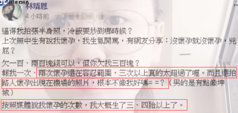 林靖恩气得出来辟谣,说根本没怀孕,照片不是她,按照媒体爆料,她已经怀孕三四胎了。
