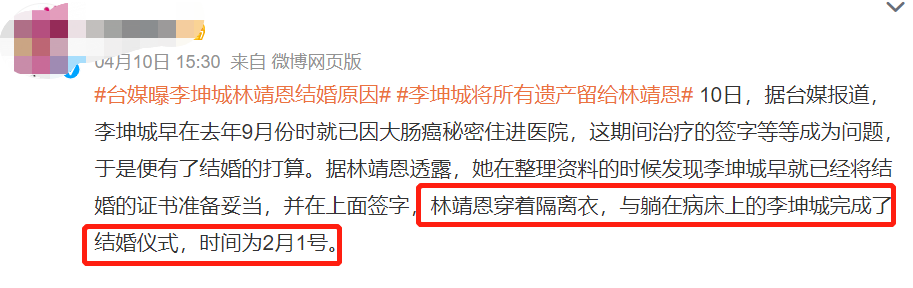 不过,据台媒报道俩人已经秘密结婚了,就在今年2月份,李坤城病重之后。