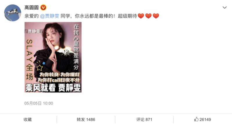其中贾静雯在之前的路透中,就热度很高,播出当天,作为好闺蜜的高圆圆,晒出贾静雯的海报为她打call。