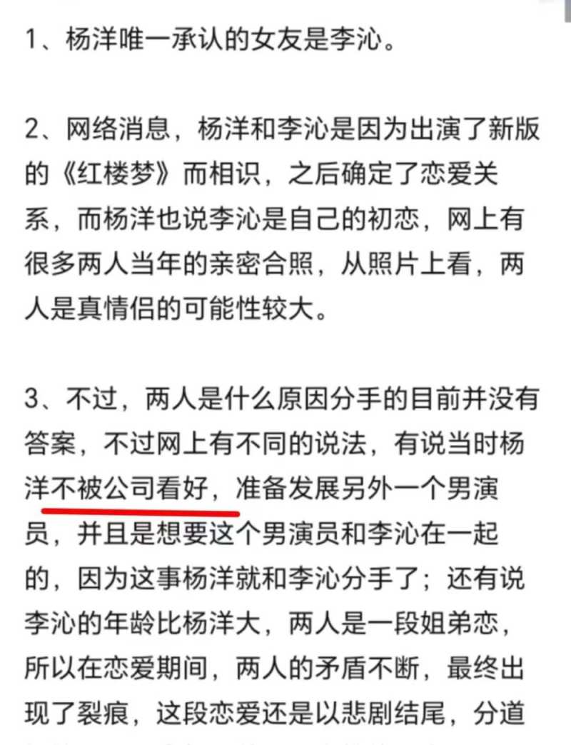 当时的杨洋和李沁都是新人,没什么名气,据说是公司原因,导致二人分手。李沁是杨洋的初恋,也是杨洋唯一承认过的女友。