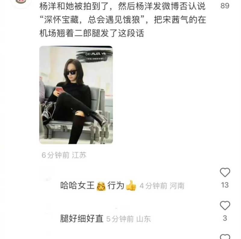 有意思的是,宋茜发这则动态的时候,被拍到是在机场翘着二郎腿,一脸不屑,还挺刚的。