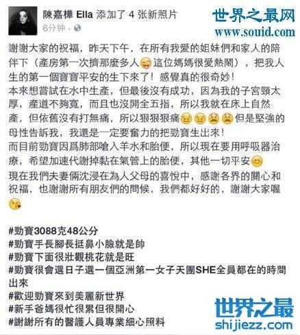 Ella陈嘉桦产子,劲宝照片公开/呛羊水动用呼吸机