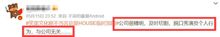 据悉,5月19日,笑果文化本在苏州有一场演出,原定演员名单中也有House,风波之后,House自然被正式除名。