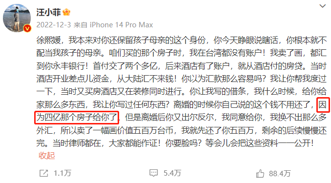 在她的帮助下,大S在和汪小菲的离婚事件中并未吃亏,本就有错的汪小菲甚至心甘情愿承包了房贷、生活费、司机费用等一大笔开销,甚至连价值4个亿的房子也归了大S。