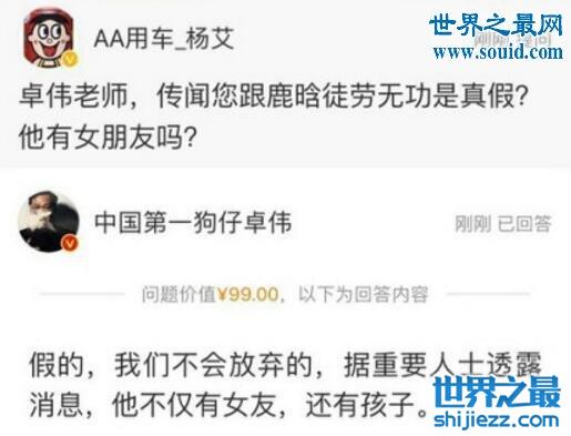 有网友向卓伟提问跟拍鹿晗是否徒劳无获,并询问鹿晗现在是否有女友,对于这样的问题,此前多次被曝出但都没有确切的消息,难免引起网友怀疑。对此卓伟回道:“假的!我们不会放弃(跟拍鹿晗)的”。另外,卓伟还再次爆料称,据重要人士透露,鹿晗不仅有女朋友,还有孩子。