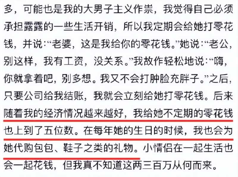 另外对于女方说给他钱花,他本人不这么认为,甚至表示自己成名后,经常给女方五位数零花钱,还买各种包包、鞋子。