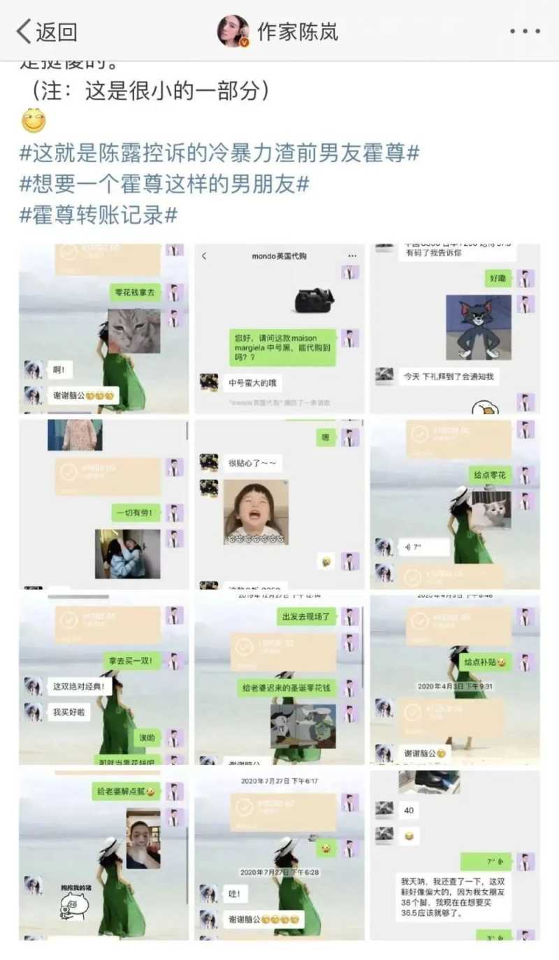 作家陈岚晒出霍尊转账九宫格,还发了一些录音以及陈露有其他富二代男友等信息。