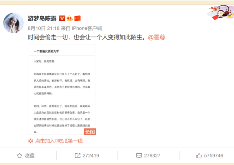 于是,陈露发了一篇《一个普通女孩的九年》小作文控诉霍尊,说自己很不容易,放弃自己的事业,陪他白手起家,甚至为他花钱,结果换来的是霍尊对他们感情的不忠,最终还被抛弃。