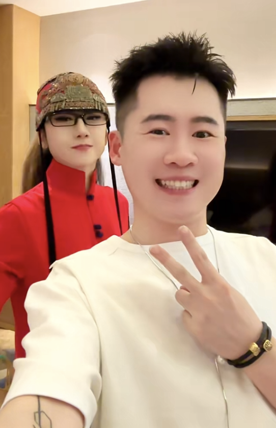 5月20日当天,化妆师更新两张与杨丽萍的亲密合影,照片中杨丽萍身穿民族风格的飘逸长裙,而他则穿着牛仔蓝衬衫,这件衬衫的设计颇为轻巧,细节之处也运用了类似的民族风元素,不少网友表示两人的装扮像极了情侣装,看上去出奇地和谐。
