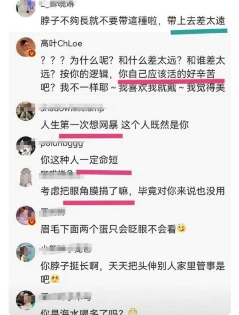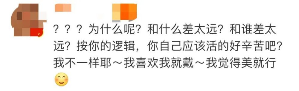 随后高叶怒怼:“???为什么呢?和什么差太远?和谁差太远?按你的逻辑,你自己应该活得好辛苦吧?我不一样耶~我喜欢我就戴~我觉得美就行。”