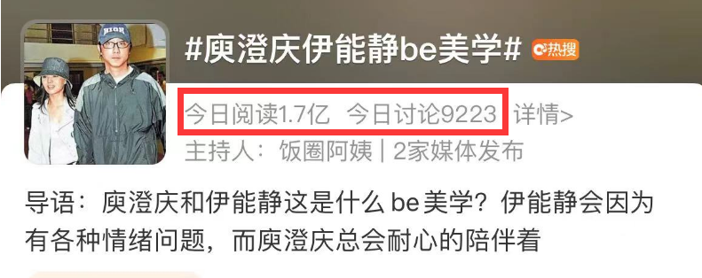 另外,庾澄庆微博还频繁上线,虽然他没有在微博发声,但粉丝看到他多次上线,也都清楚他此举的目的,想来也是时刻关注网上的舆论,况且这几日他与前妻伊能静频繁上热搜,有关他与伊能静be美学的话题更是达到1.7亿阅读,此时他发声恐怕更会引发热议。